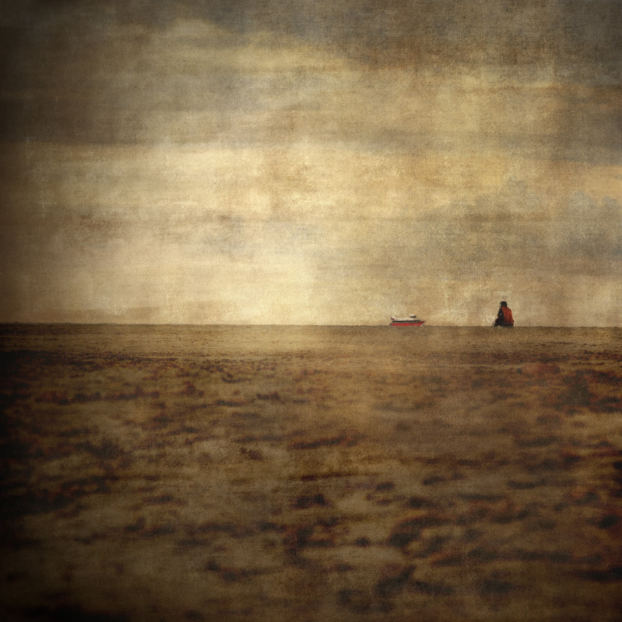 Issue d'une série de 12 oeuvres, qui montrent des personnages seuls, des couples minuscules, silhouettes dérisoires perdues dans l’immensité d’un paysage – naturel ou urbain. Un pont à Porto, une plage espagnole, un coin de désert en Egypte, la langue d’un glacier valaisan…