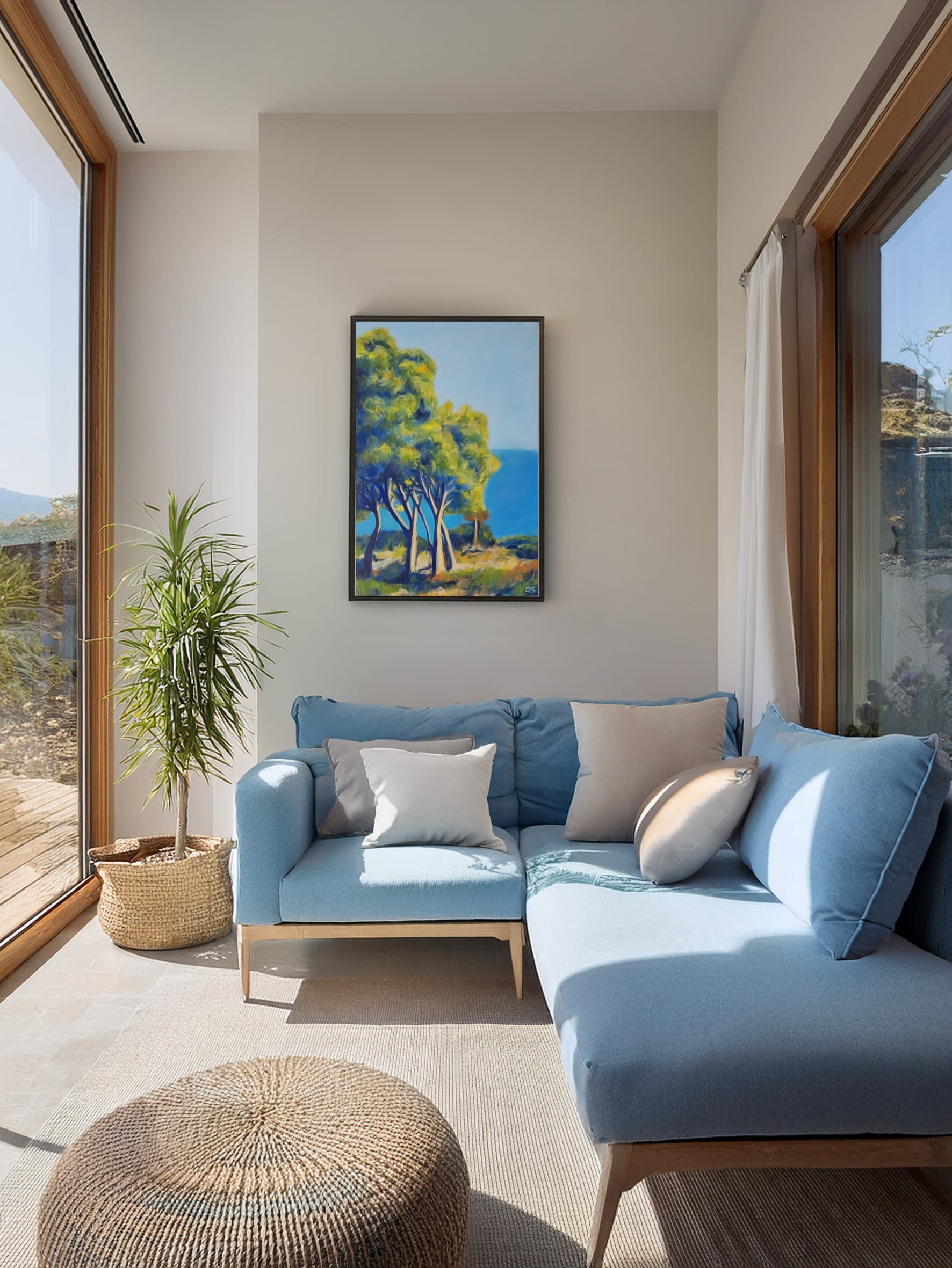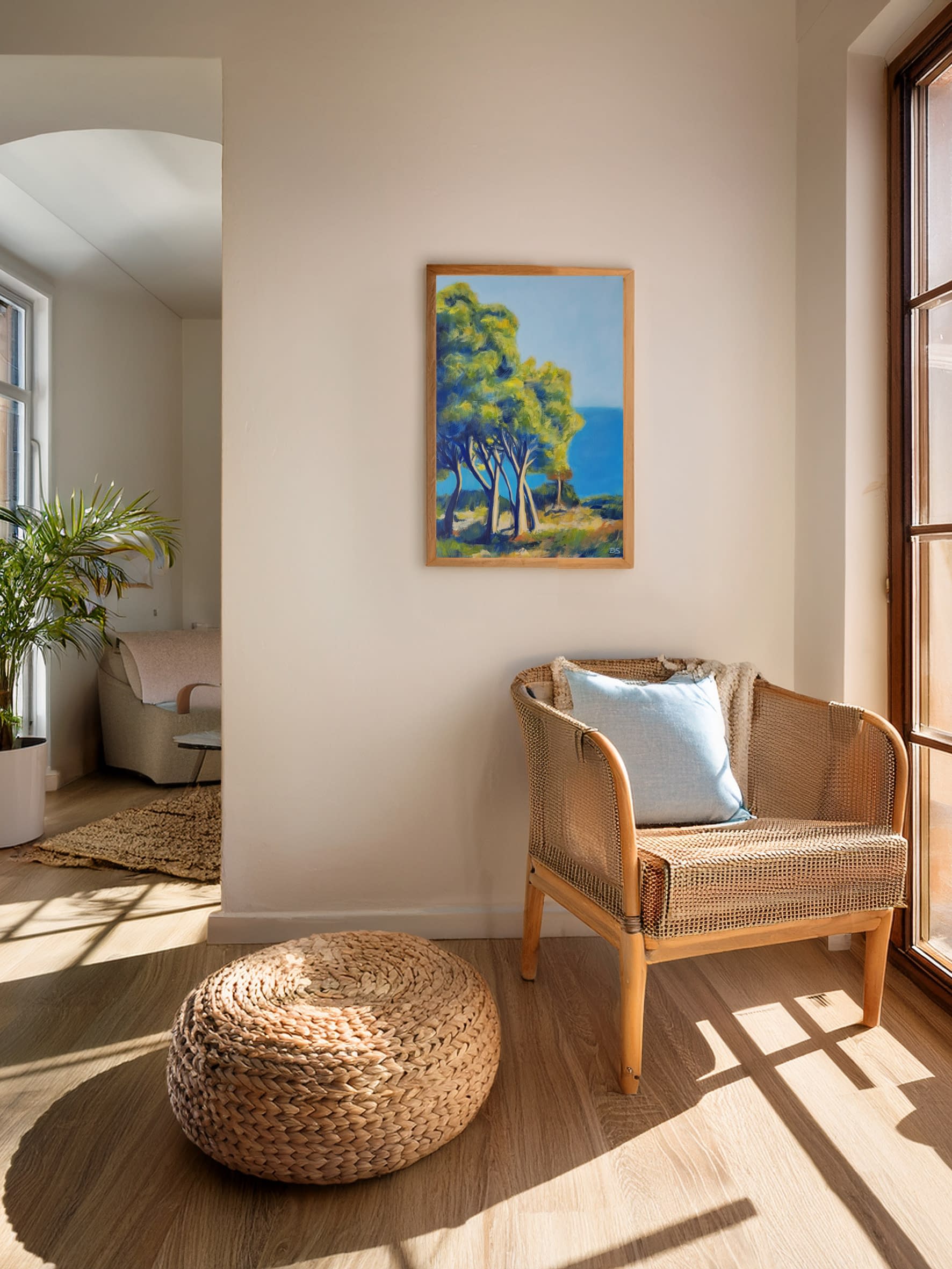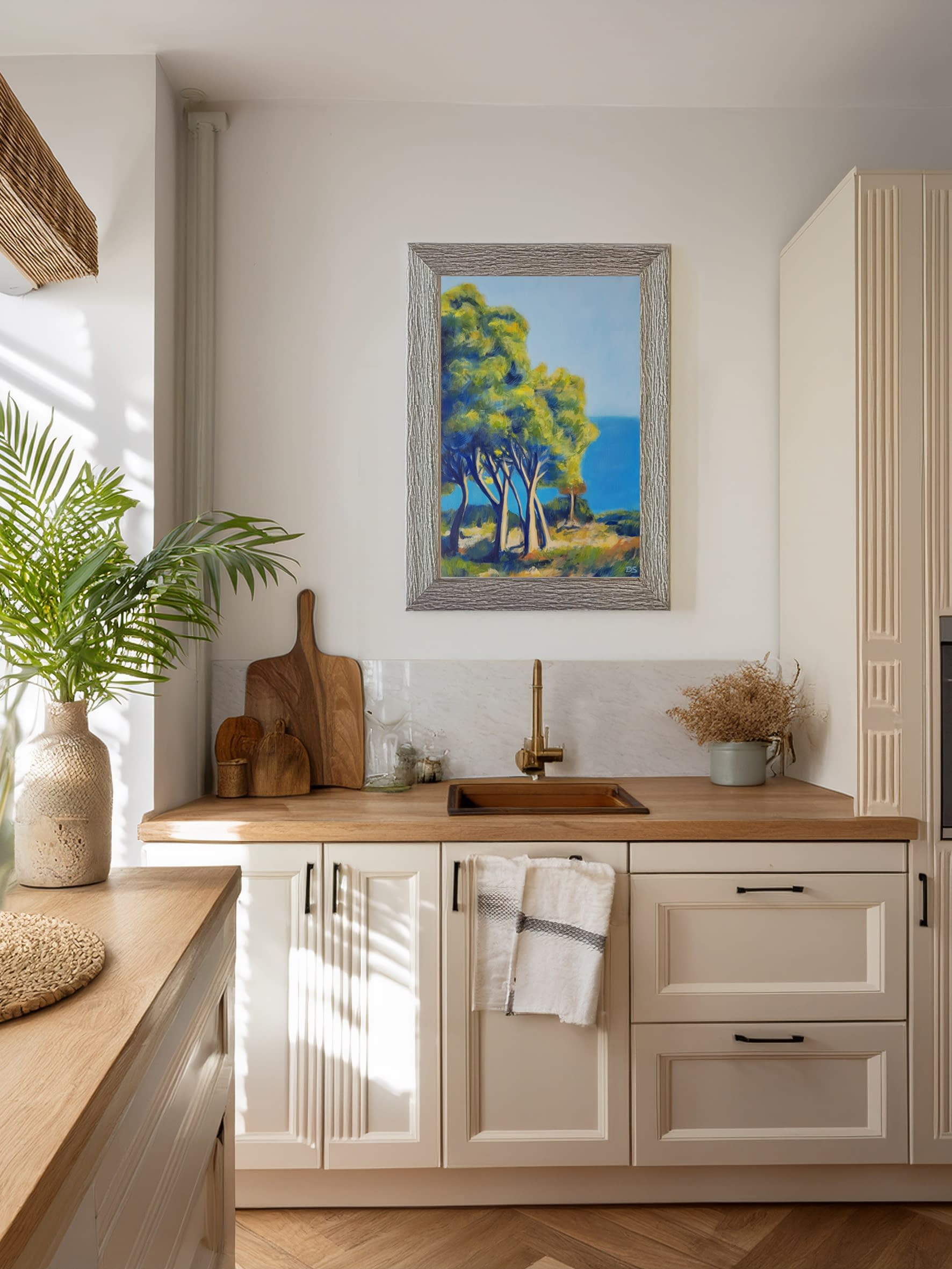 Dieses Gemälde ist ein Ausdruck einer lebendigen Erinnerung – am Meer zu stehen, dort, wo die Bäume auf das Licht treffen und das Wasser beginnt. Ich wollte diesen Moment nicht so festhalten, wie er aussah, sondern so, wie er sich anfühlte: lebendig, sonnengetränkt und sanft bewegt vom Wind.