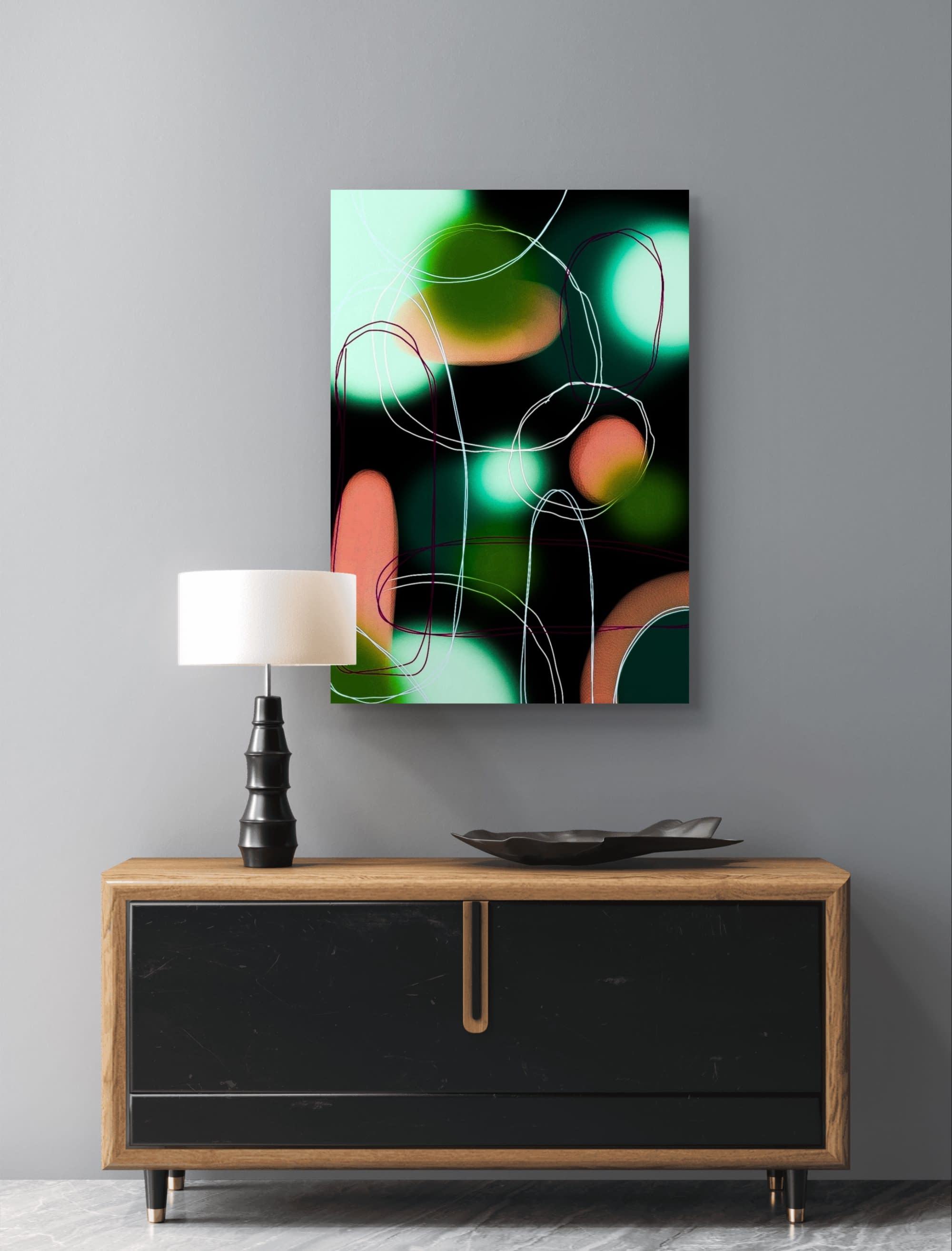 Das Kunstwerk zeigt eine abstrakte Komposition aus organischen Formen, Lichtreflexen und überlagernden Linien. Im Hintergrund dominieren dunkle Grün- und Schwarztöne, durchbrochen von leuchtenden, weichen Lichtkreisen in verschiedenen Grüntönen, die an verschwommene Lichter oder Bokeh-Fotografie erinnern.