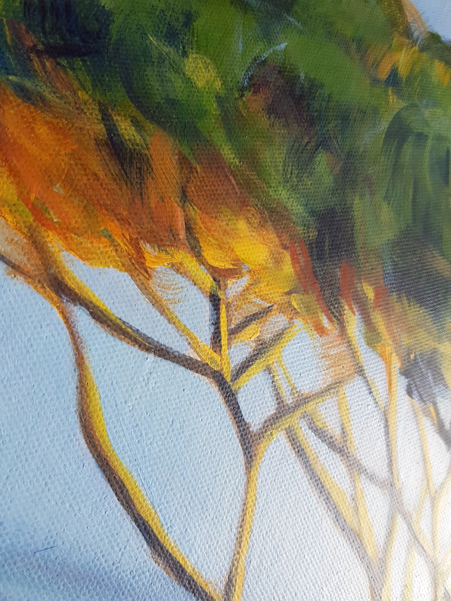 Die Komposition ist stilisiert und bewusst aufgebaut – beeinflusst von der postimpressionistischen und modernistischen Landschaftsmalerei, mit flächigen Farbaufträgen und reduzierter Tiefe. Sie spiegelt meine Faszination für das Wesen eines Ortes wider – nicht, um das Gesehene zu reproduzieren, sondern um das Gefühl zu übersetzen, das entsteht, wenn man in eine solche Umgebung eintaucht.
