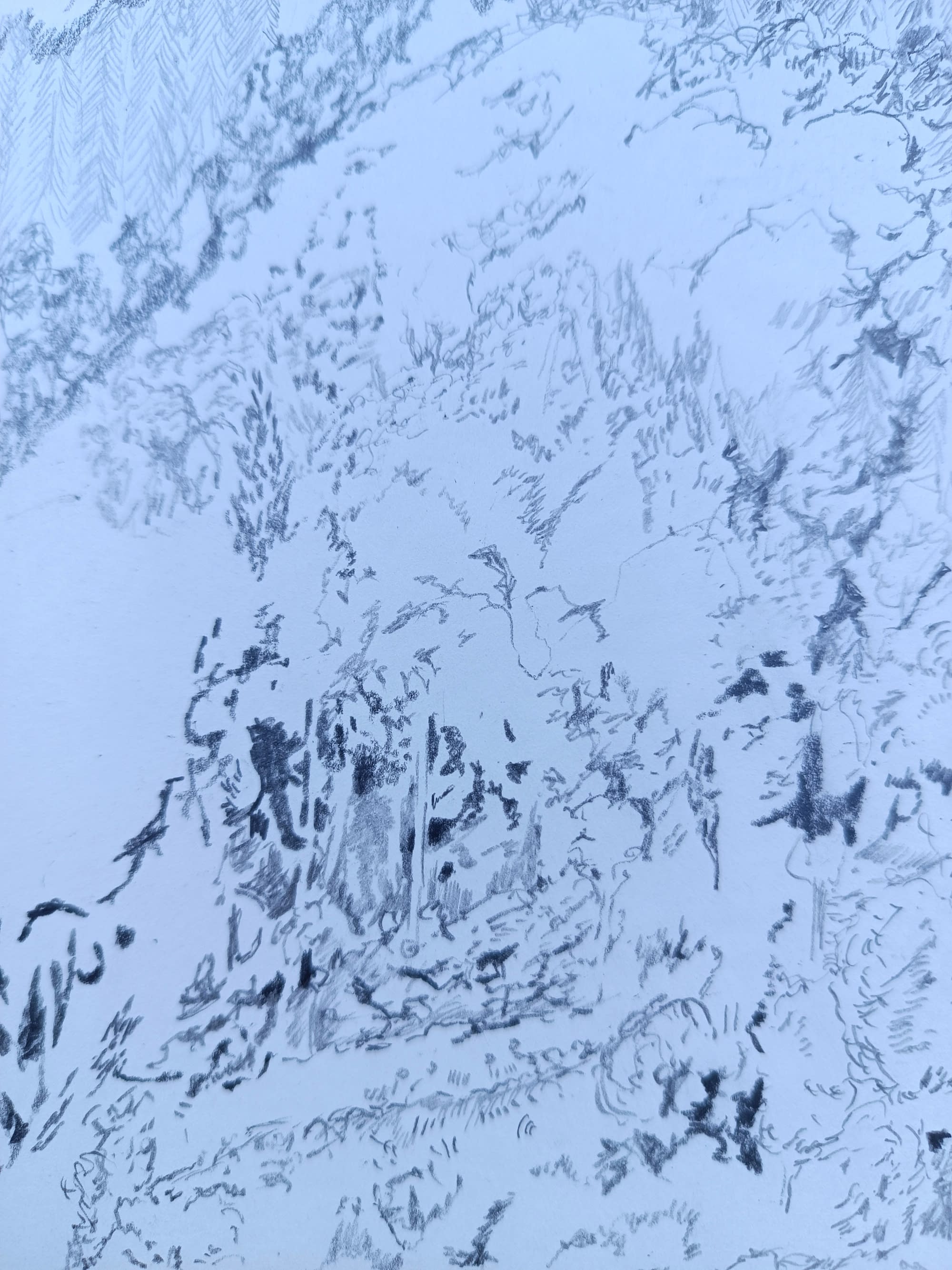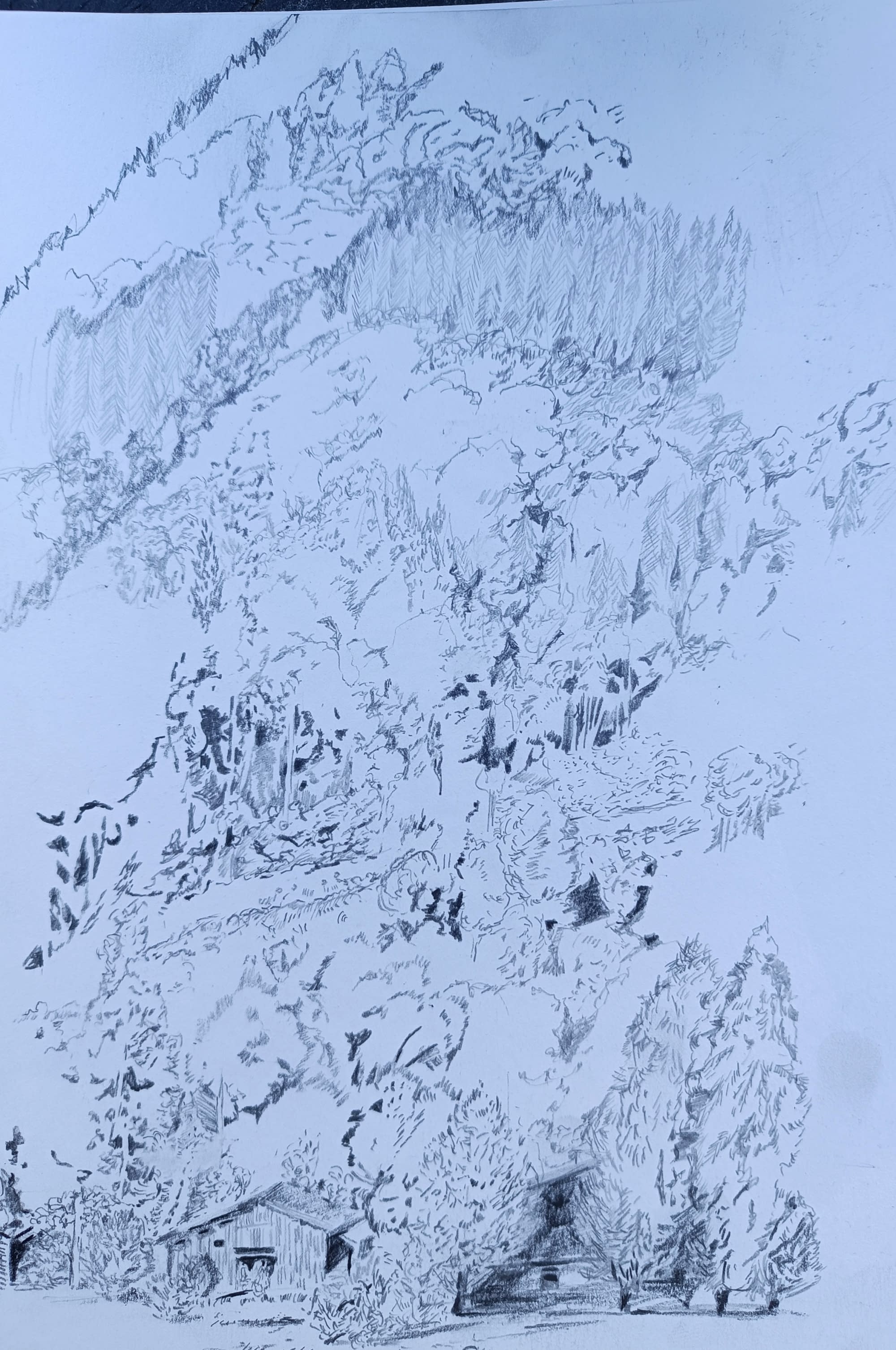 Observée du chalet et dessinée en plusieurs heures, avec des crayons graphites. Être fidèle, sentir l' atmosphère, dessiner le vent...