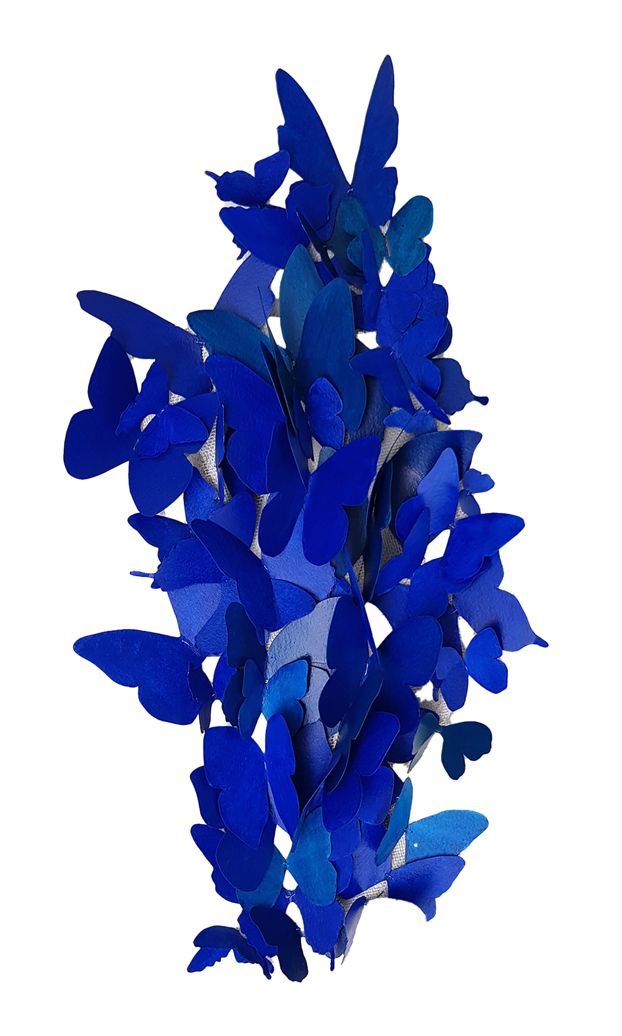 Sie erforscht das feine Gleichgewicht zwischen Form, Schatten und symbolischer Präsenz. Inspiriert hat mich die Idee von Transformation und stiller Bewegung – die Art, wie ein Schwarm von Schmetterlingen zugleich Ruhe und Flug andeuten kann. Durch die Arbeit mit überwiegend einer Farbe wollte ich nicht das Individuum betonen, sondern den kollektiven Rhythmus: einen visuellen Atemzug, der an der Wand schwebt. Die monochrome Palette schafft Einheit und lässt zugleich Licht und Schatten das Werk zum Leben erwecken.
