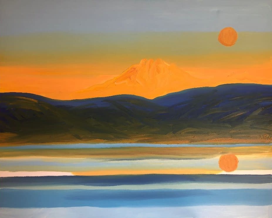Das Abendbild zeigt den Vollmond über dem Berg. Zeitgleich spielt die Abendsolle ins Bild. Es ist ein eindrückliches Werk. Im Vordergrund ist der Zugersee.