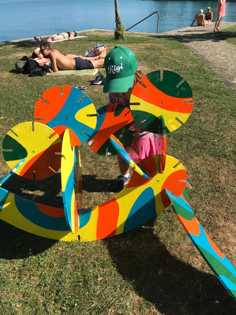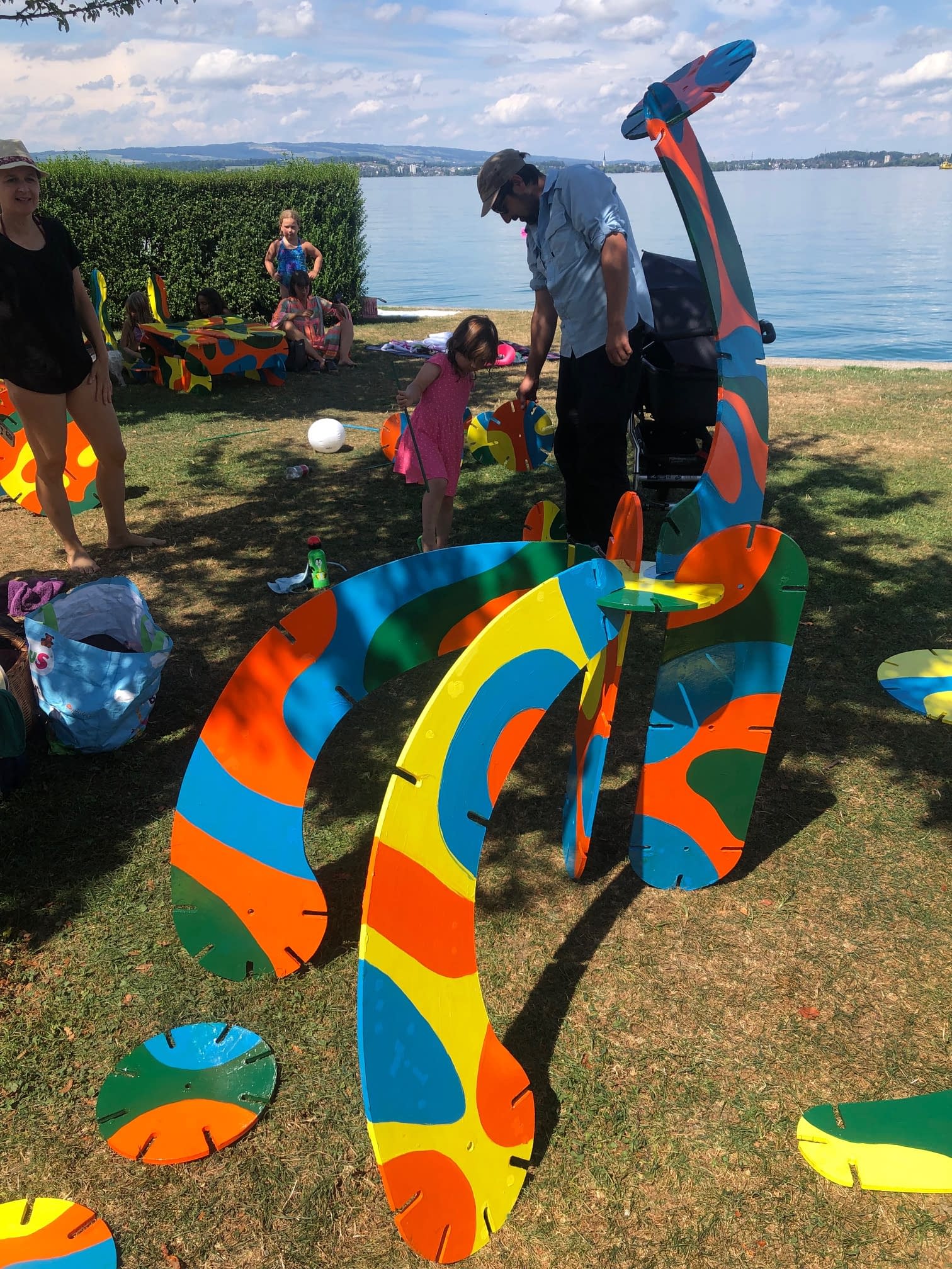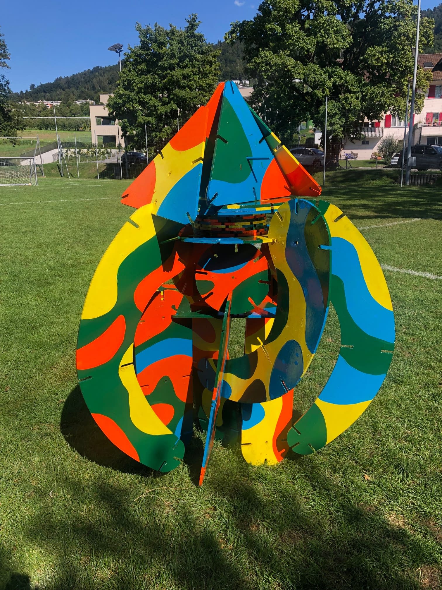 Aus dem Kinderspiel Rondi wurde eine Erweiterung mit MDF Platten erstellt. Jedes der verschiedenen Teile ist doppelt Grundiert, zweifach angemalt, und mit einem zweifach angelegten Bootslack gefertigt. Zum Spiel gehört eine Box, in der das 3 D Puzzle verstaut werden kann. Für den Transport braucht es eine Hebebühne beim Lastwagen - damit die Box auf Industrierädern verlanden werden kann. Die Farben und Formen inspirieren zum Bauen. Geeignet für Parks, Spielverleih, für den Garten oder in Innenräumen.
