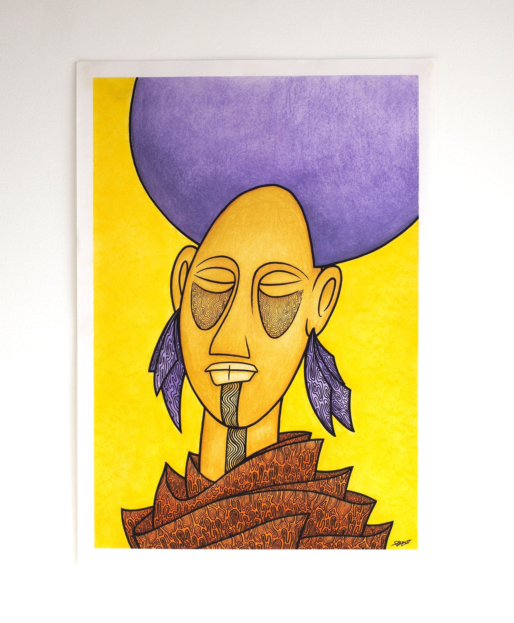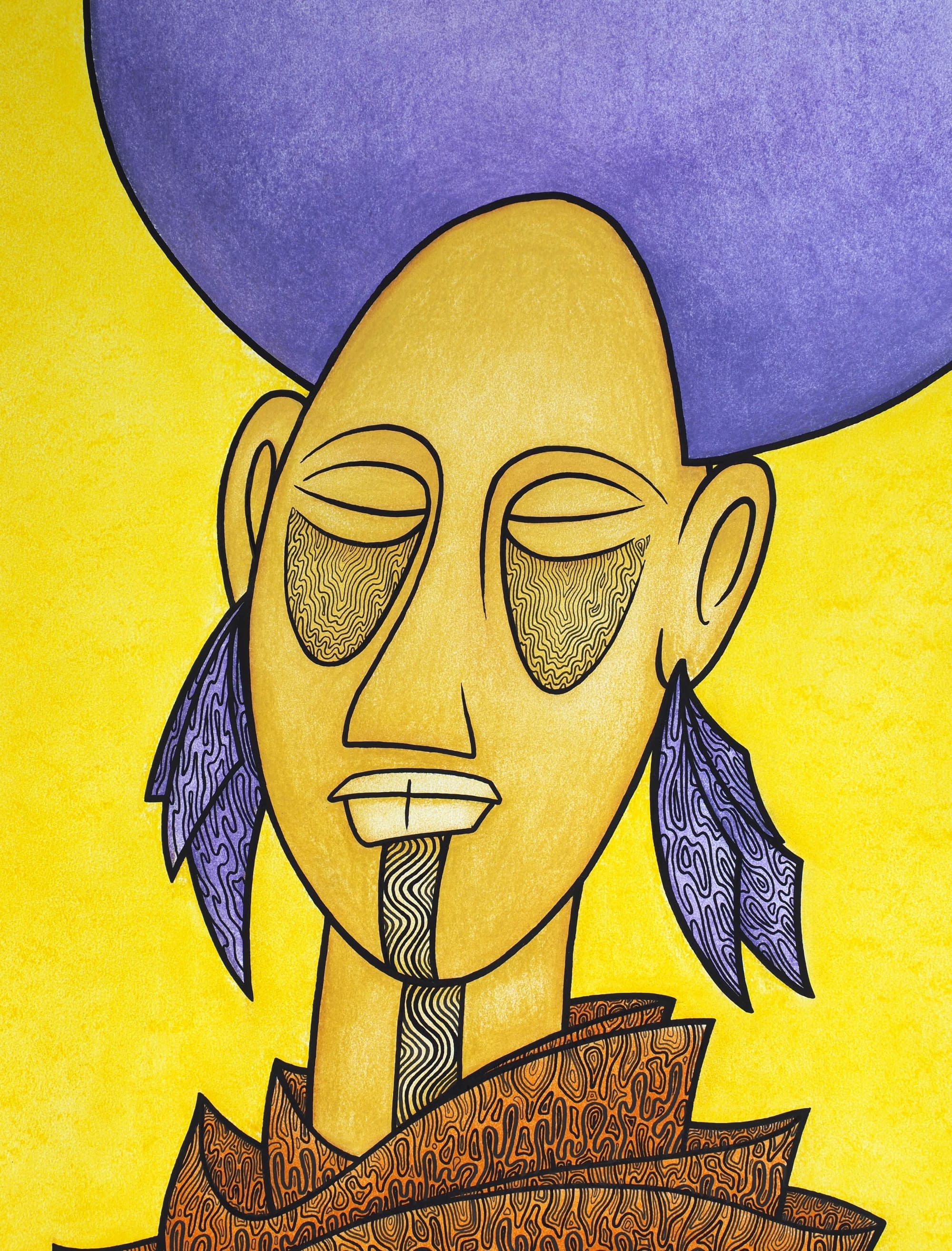 Flächig und kontrastreiche Darstellung eines Charakters in starkem Gelb, Lila und Orange.