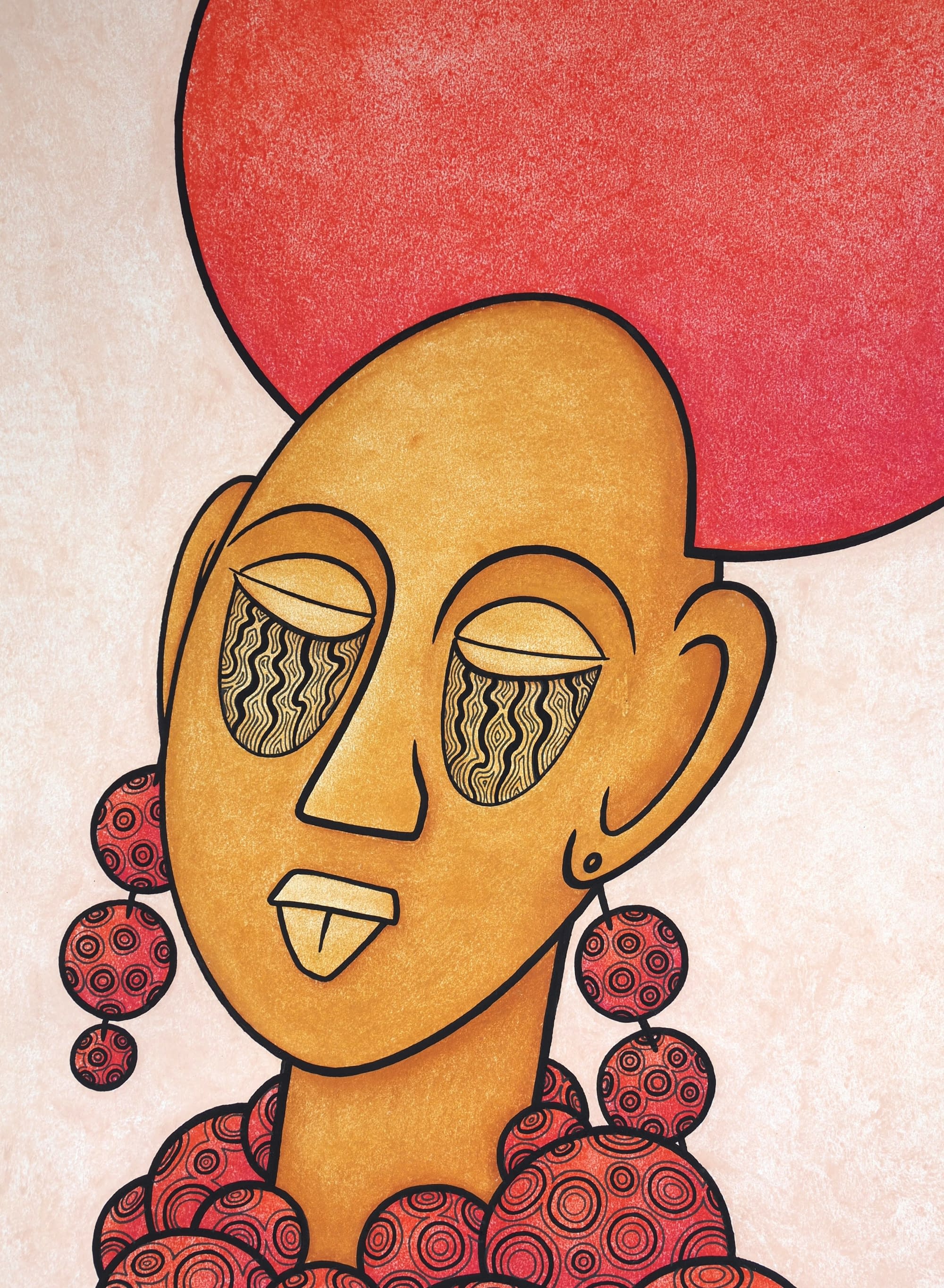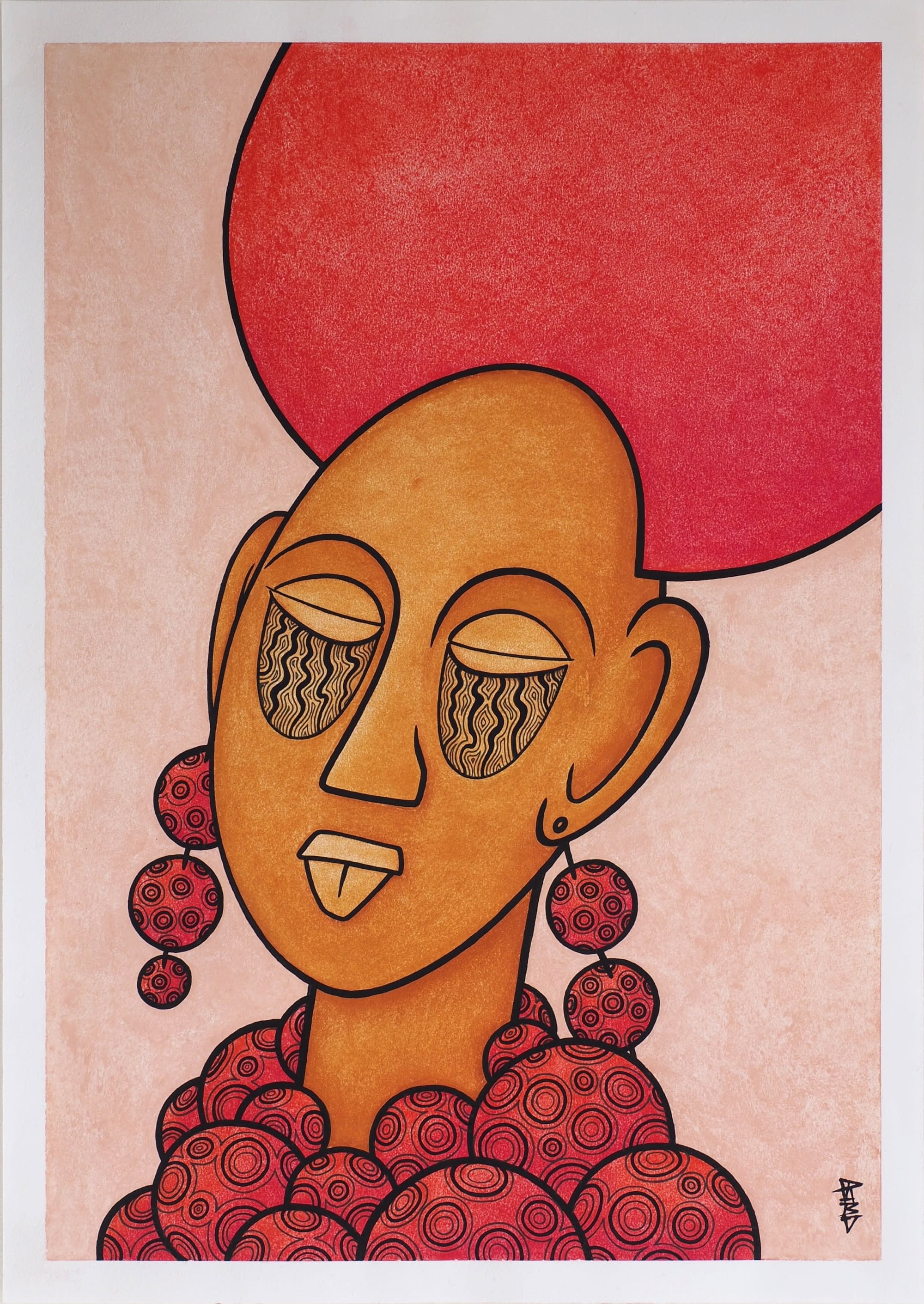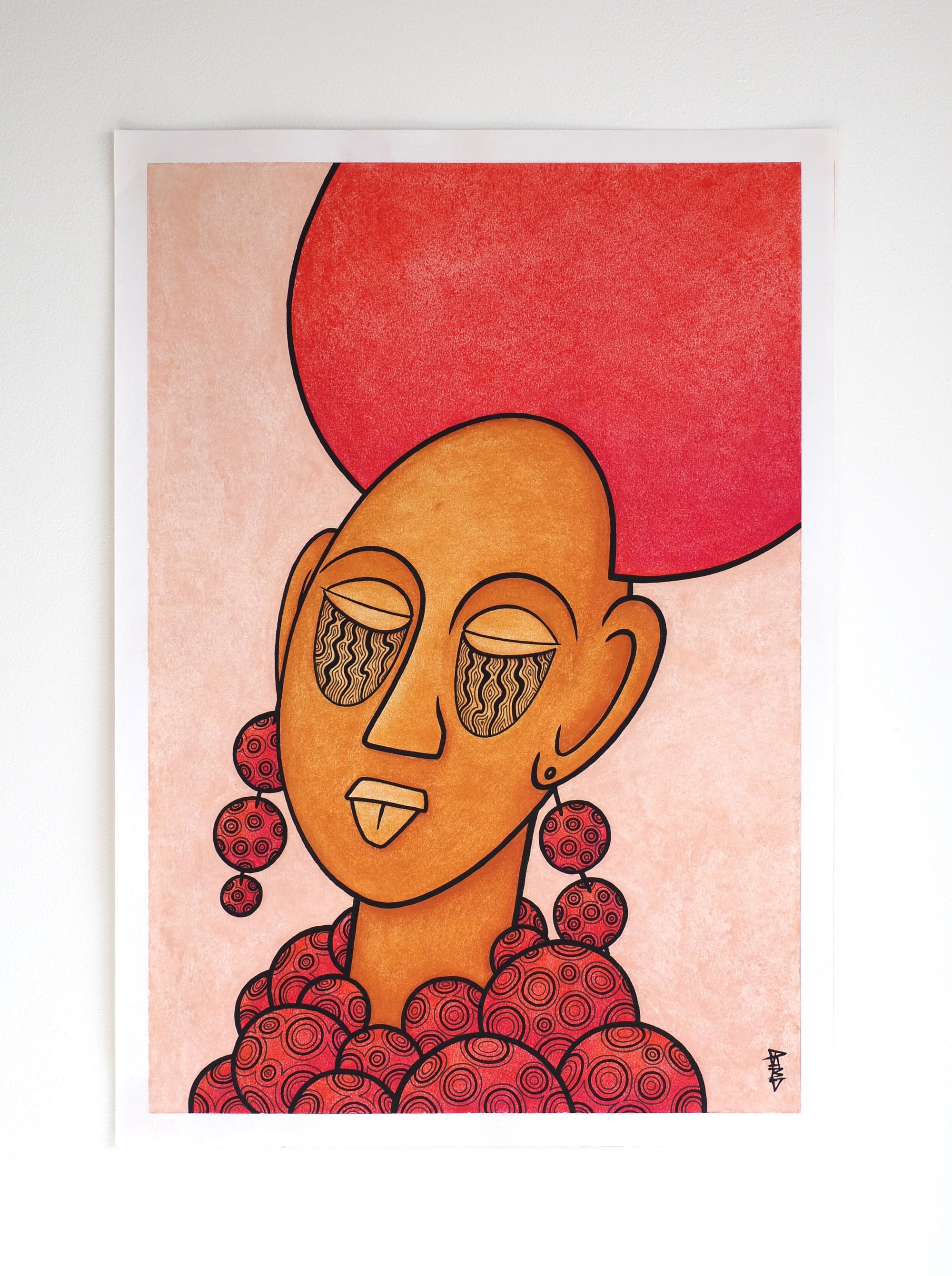 Flächige und kontrastreiche Darstellung eines Charakters in starkem Rot und Rosa.