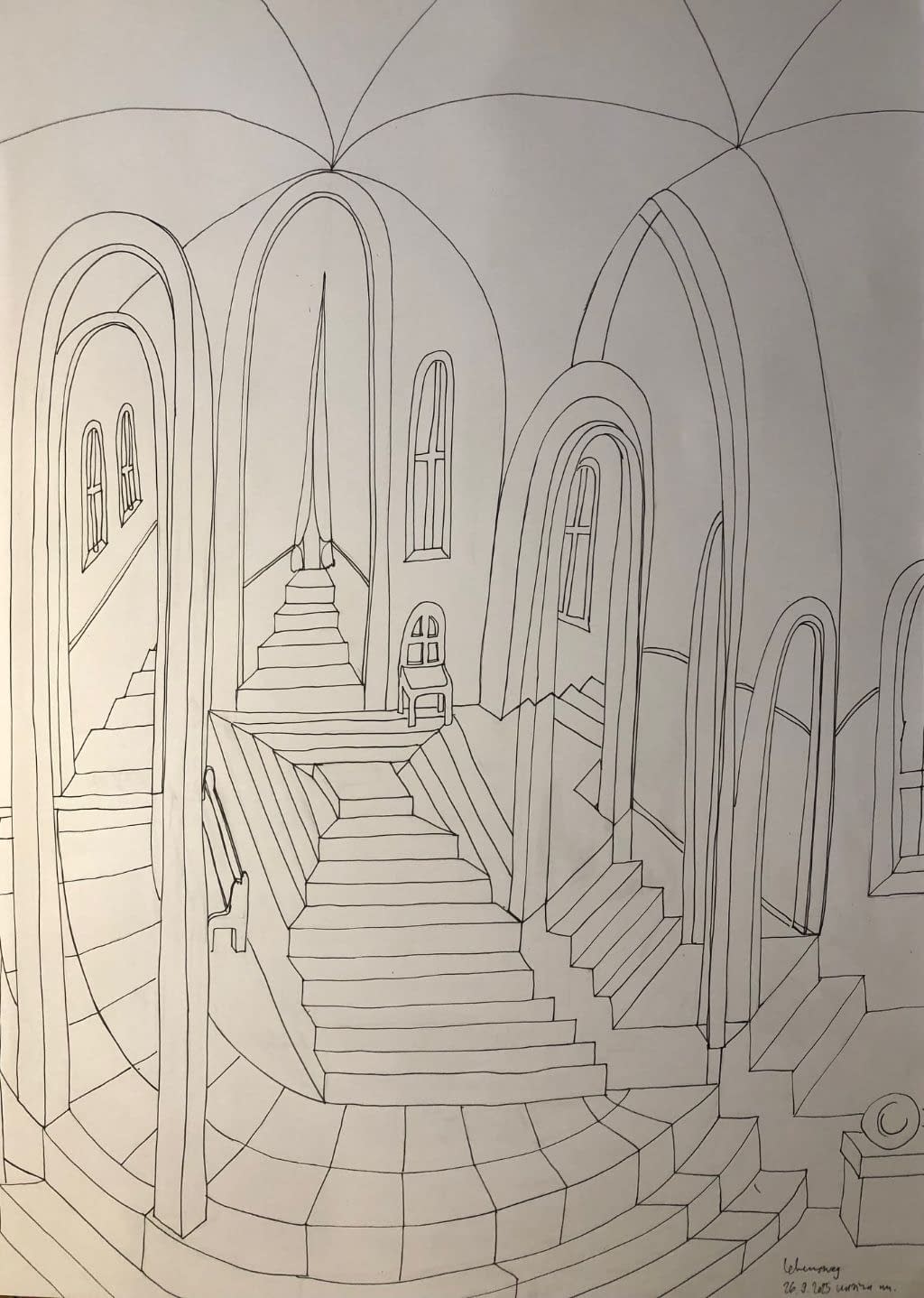 Die Haupttreppe führt nach oben. Und dann wieder nach unten. Um aber im Zentrum wieder einen Höhepunkt zu sehen. Die Gotische Baukunst lädt zum Träumen ein. Die Serie ist noch in Arbeit. Bis jetzt sind 10 Werke fertig gestellt. Gerne können sie gesichtet werden, bei mir im Atelier. Danke für Ihr Interesse.