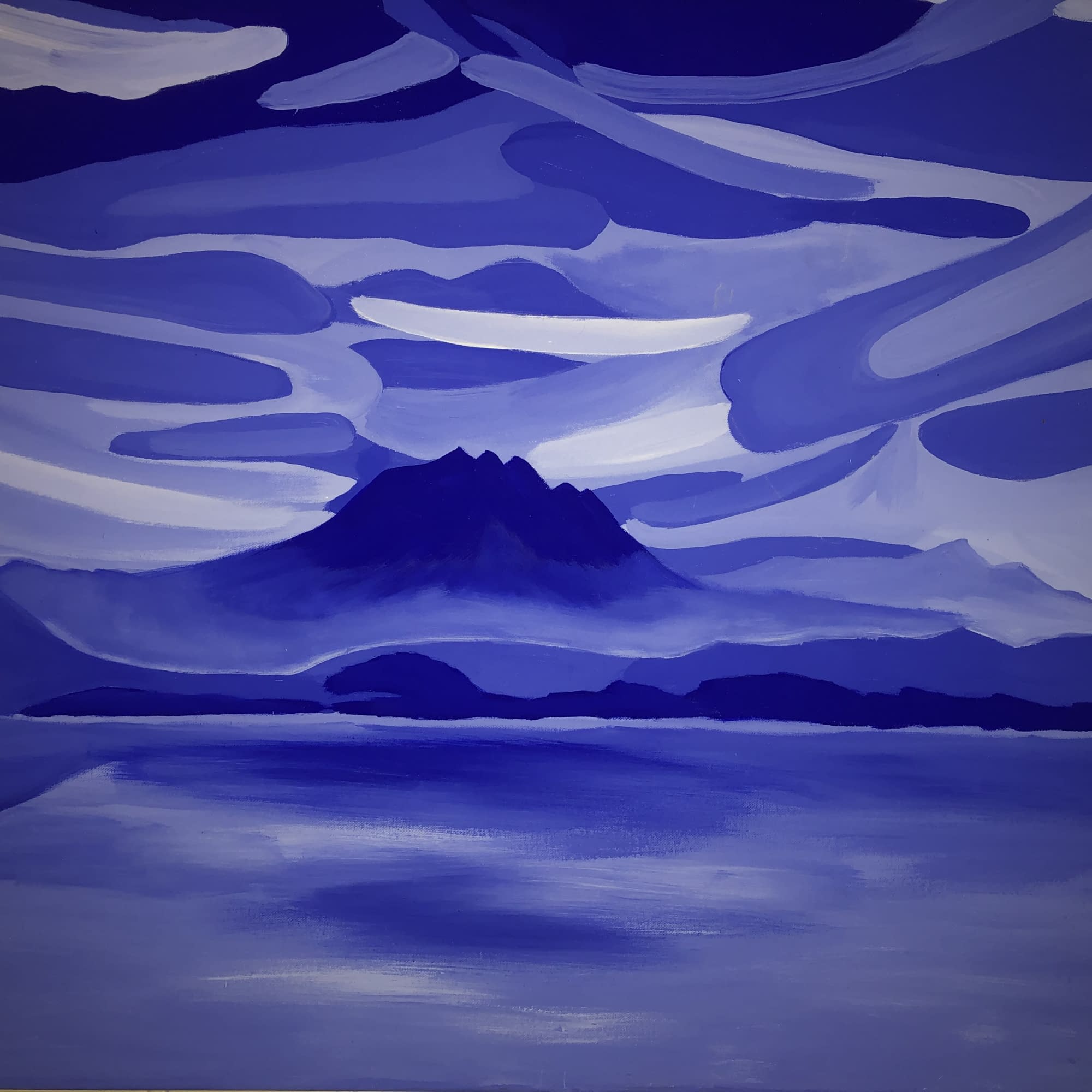 Das blaue Gouachebild ist auf Leinwand gemalt. Als Vorlage diente eine Fotografie. Die Farben entsprechen einer Momentaufnahme.